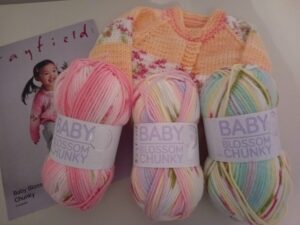 Therefore I chose Hayfield Baby Blossom Chunky Pattern code 5572 and Baby Blossom yarn Shade  Orange Blossom 372.